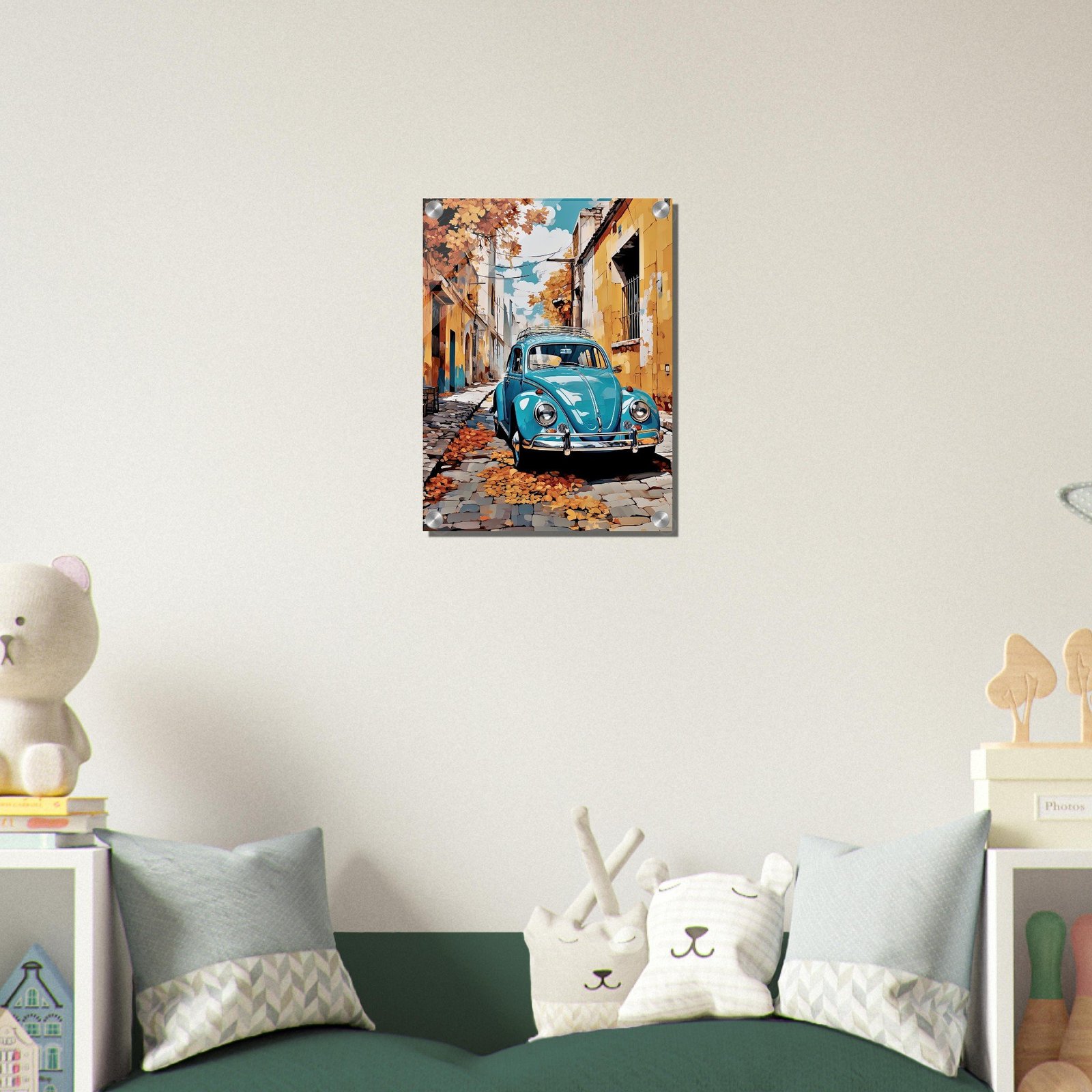 “Autumn’s Retro Ride” is a captivating portrayal of a bygone era. The image’s focal point, a pristine blue vintage beetle car, stands proudly amidst a picturesque European alleyway. The surrounding buildings, with their warm yellow hues and aged facades, tell tales of history and culture. But it’s the cascade of golden autumn leaves, both on the trees and scattered on the cobblestones, that infuses the scene with a dreamy nostalgia. Every detail, from the gleam of the car’s chrome to the play of shadows, has been meticulously captured. This artwork transports viewers to a serene, timeless moment, making it an ideal addition for those who appreciate both the elegance of classic automobiles and the enchantment of fall.