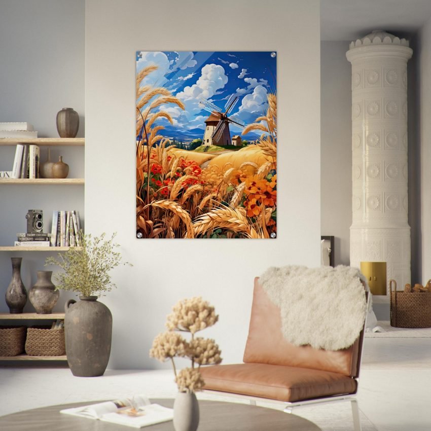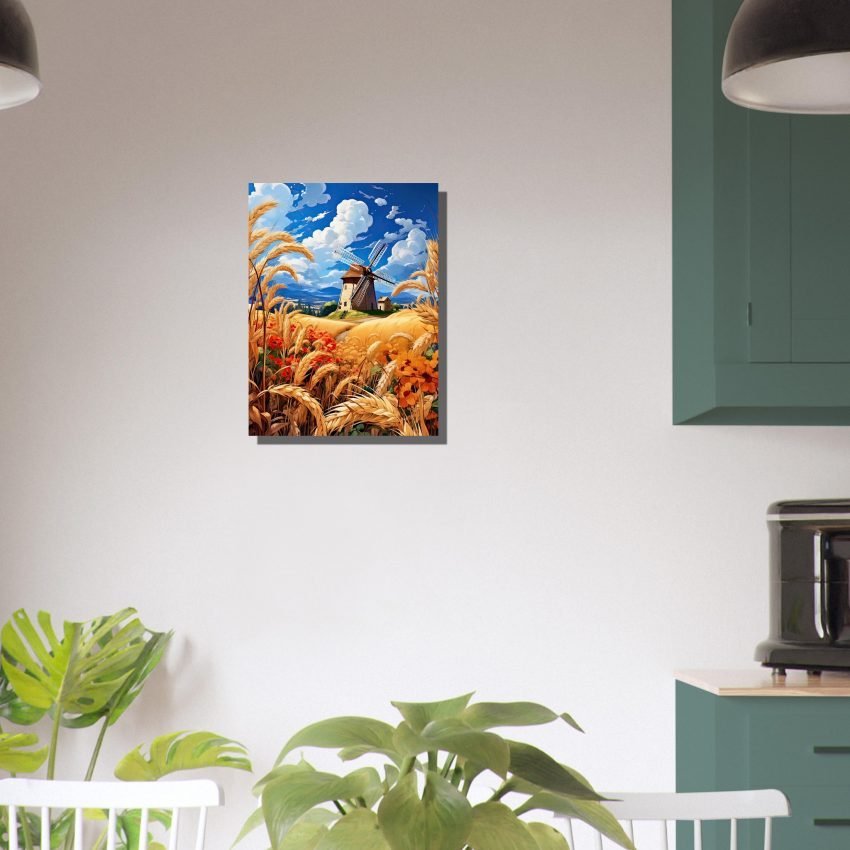 This image is a vibrant portrayal of rustic tranquility and agricultural heritage. The windmill, with its sails unfurled, speaks of a time when wind power was harnessed to grind the grain harvested from these very fields. It is an iconic structure, symbolizing human ingenuity and connection to the land.