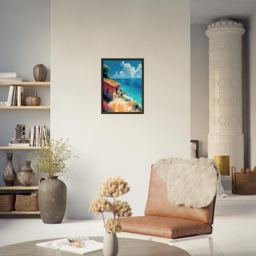 “Seaside Solace” captures the essence of coastal bliss in a digital art poster that is a hymn to the quiet beauty of the seaside. The rustic charm of an orange-roofed cottage, nestled on the edge of a cliff, provides a striking contrast against the expansive blue sea that stretches into the horizon. Flourishes of wildflowers and the gentle sway of coastal grasses frame this intimate hideaway, while seagulls soar overhead in the sunlit sky. This artwork is a peaceful invitation to embrace the stillness of a seaside retreat, making it an ideal piece for those who seek a moment of calm and a connection with the ocean’s eternal presence in their space