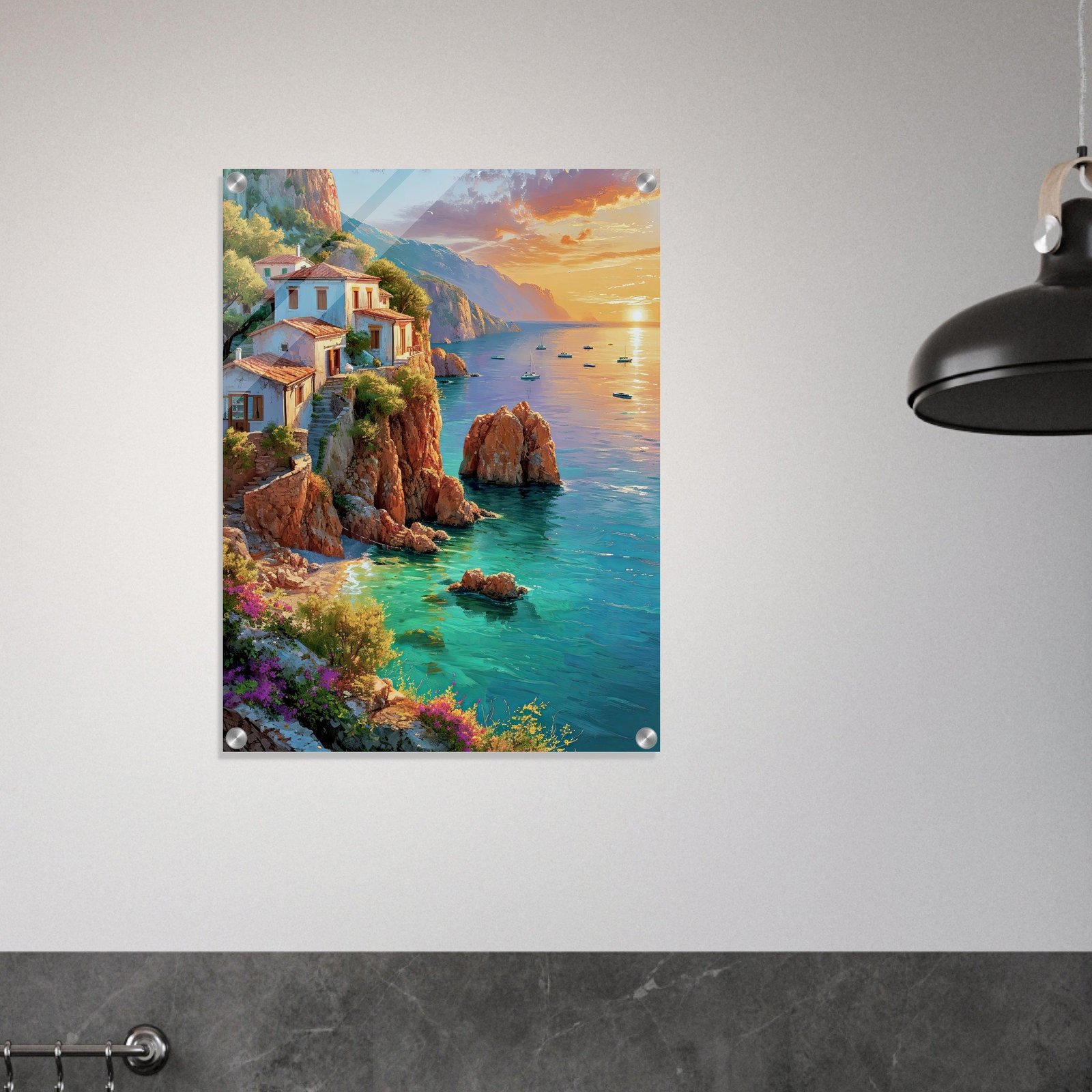 “Coastal Elegance” presents a digital art poster that captures the essence of a tranquil seaside retreat as the day draws to a close. The warm glow of the setting sun kisses the quaint houses, and the calm sea mirrors the sky’s pastel hues. Nestled atop rugged cliffs adorned with wildflowers, the scene exudes a sense of secluded luxury and natural grace. It is an invitation to savor the quiet moments of beauty that the coastal landscape provides. This piece is perfect for those who yearn for the romance of sunsets by the sea and the soothing calmness of waterfront living. Let “Coastal Elegance” add a touch of sophistication and peaceful splendor to your space.